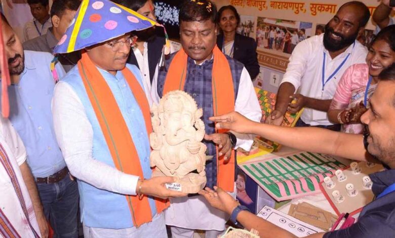 मुख्यमंत्री विष्णु देव साय को बस्तर संभाग की प्रदर्शनी अवलोकन के दौरान अंकों की बनी खुमरी पहनाई गई और उन्हें लकड़ी से बनी गणेश जी की प्रतिमा भेंट की गई। बिलासपुर संभाग के प्रदर्शनी में उन्हें शब्दों की बनी खुमरी भेंट की गई। प्रदर्शनी अवलोकन के दौरान मुख्यमंत्री विष्णु देव साय ने शासकीय शिक्षक शिक्षण महाविद्यालय के प्रशिक्षार्थियों द्वारा निर्मित सबके लिए शिक्षा डिजिटल साक्षरता की थीम पर बनी रंगोली की सराहना की।