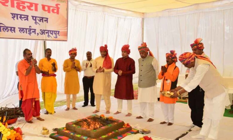 दशहरा पर्व पर भारत की सदियों प्राचीन शस्त्र-पूजन की परंपरा रही है। जिसके तहत दशहरा विजयादशमी पर्व पर पुलिस शस्त्रागार सहित जिले के थानों में भी पूरी भव्यता के साथ शस्त्र-पूजन कार्यक्रम का आयोजन किया गया। राज्य सरकार के निर्देशानुसार इस वर्ष का दशहरा पर्व महिला सशक्तिकरण और सुशासन की प्रतीक लोकमाता देवी अहिल्याबाई को समर्पित है। देवी अहिल्याबाई ने देश भर में जन-कल्याण के अनेक महती कार्य संपन्न करवाए थे और इन कार्यों की स्मृति और देवी अहिल्याबाई के योगदान से आज की पीढ़ी को अवगत करवाने और उनके सम्मान में दशहरा पर्व पर जिले भर में व्यापक स्तर पर शस्त्र-पूजन के कार्यक्रम आयोजित हुए। इस अवसर पर अनूपपुर विधायक श्री बिसाहू लाल सिंह, कोल विकास प्राधिकरण के अध्यक्ष (कैबिनेट मंत्री दर्जा) श्री राम रामलाल रौतेल, विंध्य विकास प्राधिकरण के पूर्व उपाध्यक्ष श्री रामदास पुरी, कलेक्टर श्री हर्षल पंचोली, पुलिस अधीक्षक श्री मोती उर रहमान, अतिरिक्त पुलिस अधीक्षक श्री इसरार मंसूरी सहित अन्य जनप्रतिनिधि, जिला प्रशासन एवं पुलिस प्रशासन के अधिकारी मौजूद रहे।