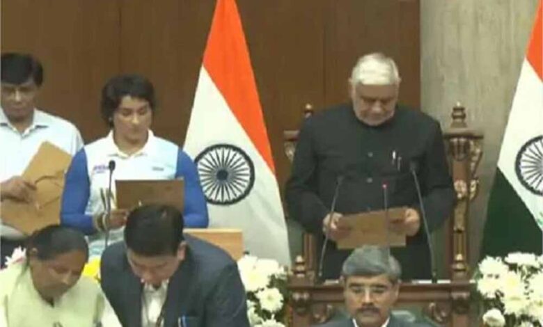 हरियाणा में BJP की नई सरकार बनने के बाद विधानसभा का पहला सत्र जारी है। इसके बाद राज्यपाल बंडारू दत्तात्रेय ने सबसे सीनियर विधायक रघुवीर कादियान को प्रोटेम स्पीकर की शपथ दिलाई। कादियान ने सभी विधायकों को शपथ दिलाई। इस दौरान नवनिर्वाचित विधायकों ने पद और गोपनीयता की शपथ ली। वहीं पहली बार 40 विधायक इस बार विधानसभा पहुंचे हैं, इन्हीं में से एक विनेश फोगाट है। सदन में शपथ लेने के लिए पहुंची चर्चित महिला कुश्ती खिलाड़ी विनेश फोगाट थोड़ा हटकर नजर आई। ऐसा लगा मानों वह विधानसभा नहीं कोई ओलंपिक या कुश्ती मुकाबले में हिस्सा लेने पहुंची हों।