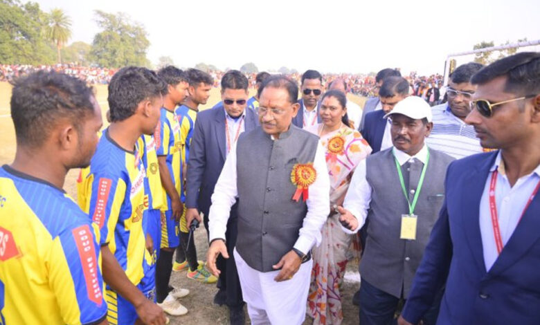 मुख्यमंत्री विष्णुदेव साय आज ग्राम पंचायत बागबहार, तहसील पत्थलगांव के मिनी स्टेडियम में आयोजित 33 वें ओपन चैलेंज ट्रॉफी फुटबॉल प्रतियोगिता के समापन समारोह में शामिल हुए। मुख्यमंत्री ने एफ. सी. माकरचुंवा, तहसील पत्थलगांव और गोंड ब्रदर्स किंजिरकेला उड़ीसा के बीच खेले जा रहे फाइनल मुकाबले का आनंद भी लिया। मुख्यमंत्री ने मिनी स्टेडियम में फुटबॉल को किक मारकर खिलाड़ियों का उत्साहवर्धन किया।