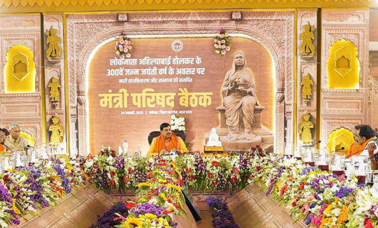 मध्य प्रदेश की डॉ. मोहन यादव ने शुक्रवार को लोकमाता देवी अहिल्या बाई होलकर की नगरी महेश्वर में आयोजित कैबिनेट बैठक में ऐतिहासिक निर्णय लिया है। मध्य प्रदेश की डॉ. मोहन यादव सरकार ने खरगोन के महेश्वर में 17 धार्मिक नगरों में शराबबंदी करने का निर्णय लिया है। इसके तहत एक अप्रैल से अब प्रदेश की 17 धार्मिक नगरों में शराब दुकाने बंद हो जाएगी। वहीं, मंत्रियों को विशेष परिस्थिति में ट्रांसफर करने का अधिकार दिए गए हैं। कैबिनेट की बैठक वंदे मातरम गान के साथ शुरू हुई। कैबिनेट बैठक लोकमाता देवी अहिल्याबाई होल्कर को समर्पित की गई है। मुख्यमंत्री के सामने टेबल पर अहिल्या माता की मूर्ति रखी गई। कैबिनेट से पहले मुख्यमंत्री डॉ. मोहन यादव ने अहिल्या घाट पर मंत्रियों के साथ नर्मदा पूजन किया।