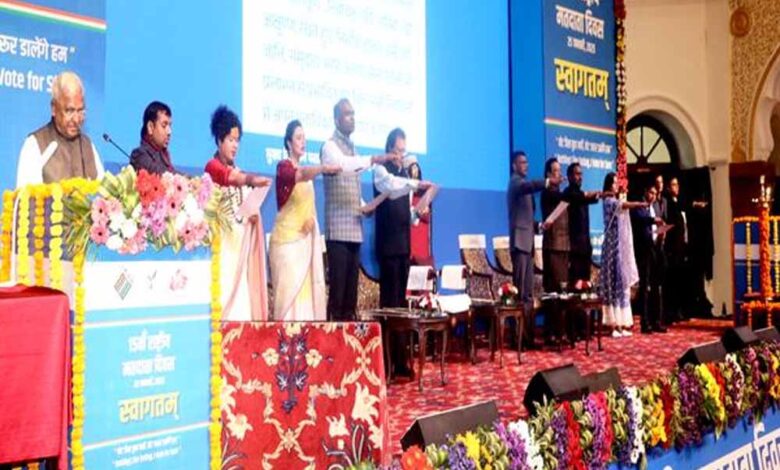 राज्यपाल श्री मंगुभाई पटेल ने कहा कि स्वतंत्र और निष्पक्ष निर्वाचन प्रणाली और मतदाताओं की सहभागिता, लोकतंत्र का मूल आधार है। निर्वाचन आयोग द्वारा इस दिशा में किए जा रहे कार्य सराहनीय है। उन्होंने कहा कि आयोग, कम मतदान वाले केन्द्रों को चिन्हित कर मतदान प्रतिशत बढ़ाने जनजागृति के विशेष प्रयास करें। राज्यपाल श्री पटेल शनिवार को कुशाभाऊ ठाकरे सभागार में 15वें राष्ट्रीय मतदाता दिवस कार्यक्रम को संबोधित कर रहे थे। उन्होंने कार्यक्रम में उपस्थित नागरिकों को मतदाता दिवस की शपथ दिलाई।
