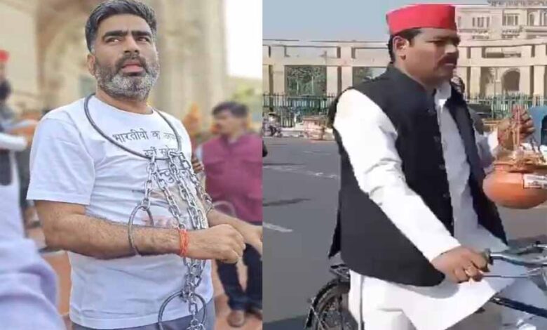 विधानसभा के बाहर समाजवादी पार्टी के विधायक ने बेड़िया पहन किए प्रर्दशन