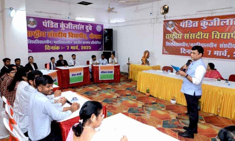 संसदीय विद्यापीठ की संचालक डॉ. प्रतिमा यादव ने कहा कि संसद और विधानसभाएँ भारत के बेहतर भविष्य का निर्माण करने वाली संस्था हैं। इन संस्थाओं के बारे में प्रत्येक युवा को जानने की उत्सुकता होनी चाहिये। कार्यक्रम में पद्मश्री विजयदत्त श्रीधर ने भी भारत के गौरवशाली लोकतंत्र परम्पराओं की जानकारी दी। उन्होंने बताया कि देश के नव-निर्माण में सत्ता पक्ष और विपक्ष, दोनों की भूमिकाएँ महत्वपूर्ण होती हैं। प्रतियोगिता का संचालन प्राचार्य शासकीय आदर्श महाविद्यालय विदिशा डॉ. ब्रह्मदीप अलूने ने किया। उच्च शिक्षा उत्कृष्ट संस्थान भोपाल प्रथम, सरोजिनी नायडू महाविद्यालय द्वितीय और पीसीएम कॉलेज ऑफ एक्सीलेंस हमीदिया ने तृतीय स्थान प्राप्त किया।