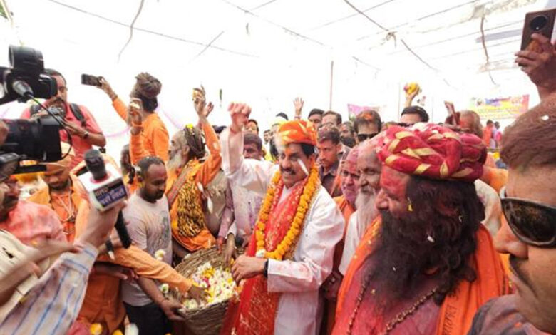 मुख्यमंत्री डॉ. यादव ने अखिल भारतीय अखाड़ा परिषद अध्यक्ष रविंद्र पूरी जी महाराज और साधु संतो पर पुष्प-वर्षा कर खेली होली