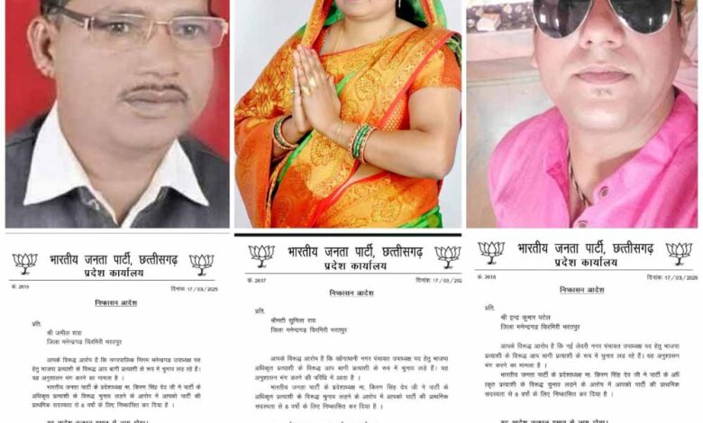 प्रदेश भाजपा कार्यालय से जारी आदेश संख्या 2615, 2616, 2617 , दिनांक 17 /03/2025 के तहत, जमील शाह, इंद्र कुमार पटेल और सुमिला राय को तत्काल प्रभाव से पार्टी से बाहर कर दिया गया। इन सभी नेताओं ने मनेन्द्रगढ़ नगरपालिका, लेदरी नगर पंचायत, खोंगापानी नगर पंचायत चुनाव में पार्टी लाइन के विरुद्ध जाकर बगावत की थी।