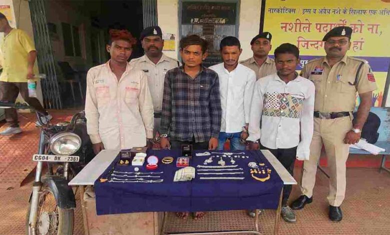 चोरी के मुख्य आरोपी गुलशन कुमार पटेल (21, बलौदा बाजार) सहित नंद कुमार यादव (21), हरि विश्वकर्मा (22), और धनेंद्र देवदास (21) को रायपुर पुलिस ने गिरफ्तार किया है. गुलशन और हरि पहले भी चोरी के मामले में जेल जा चुके हैं. आरोपियों से सोने-चांदी के जेवर, नकदी और चोरी की मोटरसाइकिल सहित 6,50,000 रुपए का माल बरामद किया गया है. आरोपियों के खिलाफ धारा 331(4), 305, 3(5) BNSS के तहत मामले दर्ज पुलिस आगे की कार्रवाई कर रही.