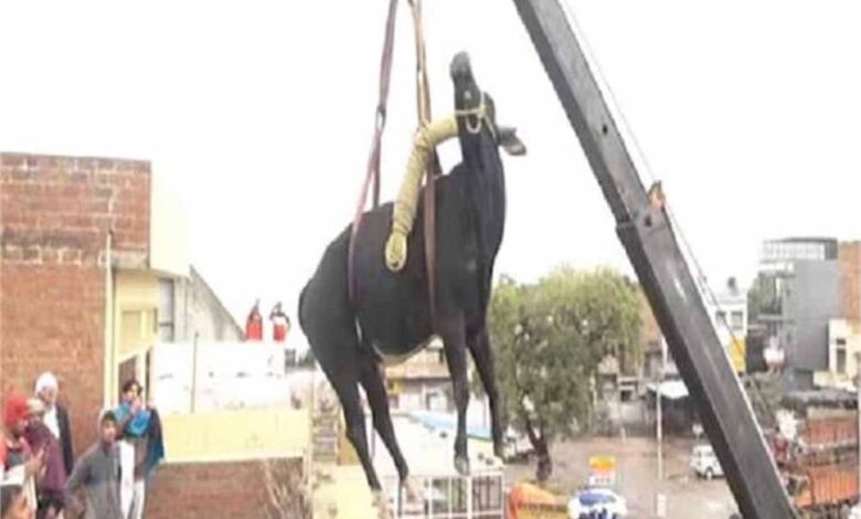 सांड को इस प्रकार घर में घुसा देख लोगों की भीड़ इकट्ठा हो गई, लेकिन मजाल किसी की कि कोई उस सांड को टच भी कर सके। सांड को क्रेन के जरिये उतारा गया। इस दौरान वहां मौजूद लोगों ने मोबाइल के कैमरे में पूरी घटना रिकॉर्ड की।