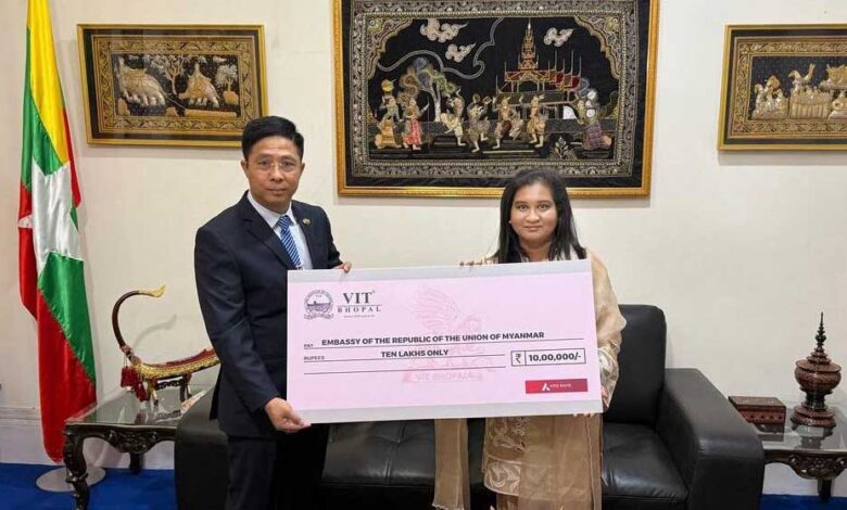 यह योगदान वीआईटी भोपाल की ओर से दिया गया और इसे म्यांमार गणराज्य के राजदूत, महामहिम ज़ॉ ओ को 24 अप्रैल 2025 गुरुवार के दिन नई दिल्ली स्थित म्यांमार दूतावास में औपचारिक रूप से सौंपा गया।