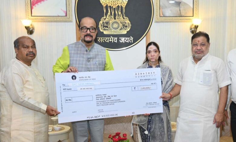 राज्यपाल रमेन डेका ने जम्मू-कश्मीर के पहलगाम में हुए आतंकी हमले में जान गंवाने वाले रायपुर निवासी स्वर्गीय दिनेश अग्रवाल के परिजनों को आज यहां राजभवन में 2 लाख रूपए की सहायता राशि संबंधी चेक प्रदान किया।