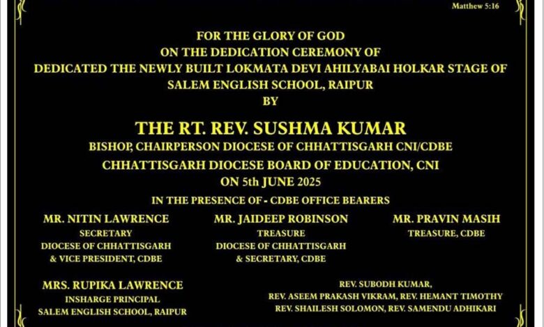 सलेम इंग्लिश स्कूल, रायपुर में दिनांक 5 जून 2025 को एक ऐतिहासिक और गौरवपूर्ण क्षण का साक्षी बना, जब छत्तीसगढ़ डायोसिस बोर्ड ऑफ एजुकेशन (CDBE) के अंतर्गत निर्मित नवीन मंच को 'लोकमाता देवी अहिल्याबाई होलकर मंच' के नाम से समर्पित किया गया।