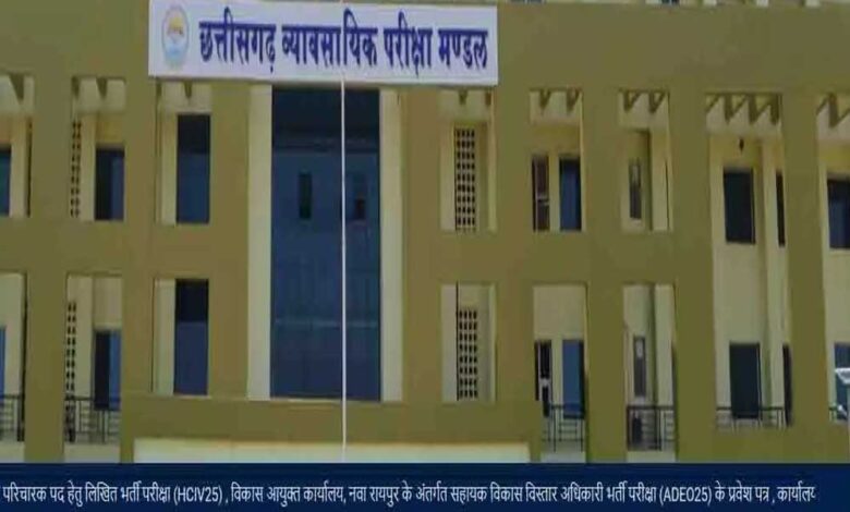 छत्तीसगढ़ व्यावसायिक परीक्षा मण्डल रायपुर द्वारा 15 जून 2025 को सहायक विकास विस्तार अधिकारी की भर्ती परीक्षा प्रातः 10 बजे से अपरान्ह 12.15 बजे तक जगदलपुर के 21 परीक्षा केन्द्रों में आयोजित की जाएगी। जिसके तहत केन्द्र क्रमांक 17001 शासकीय काकतीय पीजी कॉलेज धरमपुरा नम्बर 02 जगदलपुर, केन्द्र क्रमांक 17002 सक्सेस काॅनवेंट हायर सेकण्डरी स्कूल दीनदयाल उपाध्याय वार्ड-19 जगदलपुर, केन्द्र क्रमांक 17003 शासकीय दन्तेश्वरी पीजी महिला महाविद्यालय शांति नगर जगदलपुर, केन्द्र क्रमांक 17004 शासकीय महारानी लक्ष्मीबाई कन्या हायर सेकण्डरी स्कूल जगदलपुर क्रमांक-1, केन्द्र क्रमांक 17005 शासकीय बहुउद्देशीय हायर सेकेण्डरी स्कूल जगदलपुर, केन्द्र क्रमांक 17006 शासकीय कन्या हायर सेकण्डी स्कूल क्रमांक-02 राजेन्द्र नगर वार्ड गीदम रोड जगदलपुर, केन्द्र क्रमांक 17007 स्वामी आत्मानंद एक्सीलेंट इंग्लिश मीडियम शासकीय हायर सेकेण्डरी स्कूल धरमपुरा स्पोर्ट्र्स काम्पलेक्स धरमपुरा जगदलपुर, केन्द्र क्रमांक 17008 स्वामी आत्मानंद एक्सीलेंट इंग्लिश मीडियम स्कूल अग्रसेन चैक संजय मार्केट रोड जगदलपुर, केन्द्र क्रमांक 17009 स्वामी आत्मानंद एक्सीलेंट हिन्दी मीडियम शासकीय हायर सेकण्डरी स्कूल रेल्वे काॅलोनी जगदलपुर, केन्द्र क्रमांक 17010 धरमु माहरा शासकीय महिला पाॅलिटेक्निक धरमपुरा-2 जगदलपुर, केन्द्र क्रमांक 17011 शासकीय हायर सेकण्डरी स्कूल भगत सिंह सिविल लाईन पथरागुड़ा लालबाग के पास जगदलपुर, केन्द्र क्रमांक 17012 बाल विहार हायर सेकण्डरी स्कूल बालाजी वार्ड जगदलपुर, केन्द्र क्रमांक 17013 निर्मल हायर सेकण्डरी स्कूल लालबाग जगदलपुर, केन्द्र क्रमांक 17014 शासकीय हायर सेकण्डरी स्कूल आसना तहसील जगदलपुर, केन्द्र क्रमांक 17015 श्री वेदमाता गायत्री शिक्षा महाविद्यालय कंगोली सरस्वती शिशु मंदिर परिसर कंगोली जगदलपुर, केन्द्र क्रमांक 17016 विद्या ज्योति हायर सेकण्डरी स्कूल दंतेश्वरी वार्ड, गीदम रोड जगदलपुर, 17017 श्री विद्यापती एकेडमी बहादुरगुड़ा जगदलपुर, केन्द्र क्रमांक 17018 शासकीय हायर सेकण्डरी स्कूल पोटानार, तहसील तोकापाल, 17019 क्राईस्ट काॅलेज राजेन्द्र नगर गीदम रोड जगदलपुर, केन्द्र क्रमांक 17020 शासकीय हाई स्कूल पनारापारा जगदलपुर और केन्द्र क्रमांक 17021 शहीद गुण्डाधूर काॅलेज कृषि एवं अनुसंधान केंद्र कुम्हरावण्ड जगदलपुर शासकीय पर उक्त भर्ती परीक्षा आयोजित की जाएगी।