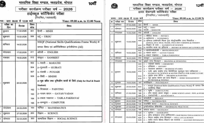 मध्य प्रदेश माध्यमिक शिक्षा मंडल की ओर से जारी टाइम टेबल के अनुसार, दोनों कक्षाओं का पहला पेपर हिंदी विषय का होगा। टाइम टेबल के अनुसार, 12वीं की परीक्षाएं 7 फरवरी से 3 मार्च 2026 तक चलेंगी। वहीं 10वीं की परीक्षाएं 11 फरवरी से 2 मार्च तक चलेंगी। परीक्षा का समय सुबह 9 बजे से लेकर 12 बजे तक निर्धारित है।