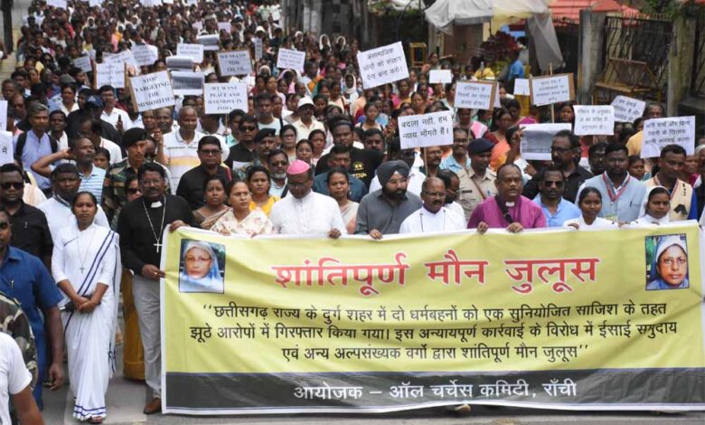 झारखंड के रांची में ऑल चर्चेस कमेटी रांची के द्वारा छत्तीसगढ़ में दो धर्म बहनों के साथ घटित घटना के विरोध में शांतिपूर्ण मौन जुलूस निकाला गया। इस जुलूस में राज्य की कृषि, पशुपालन एवं सहकारिता मंत्री शिल्पी नेहा तिर्की भी शामिल हुई।