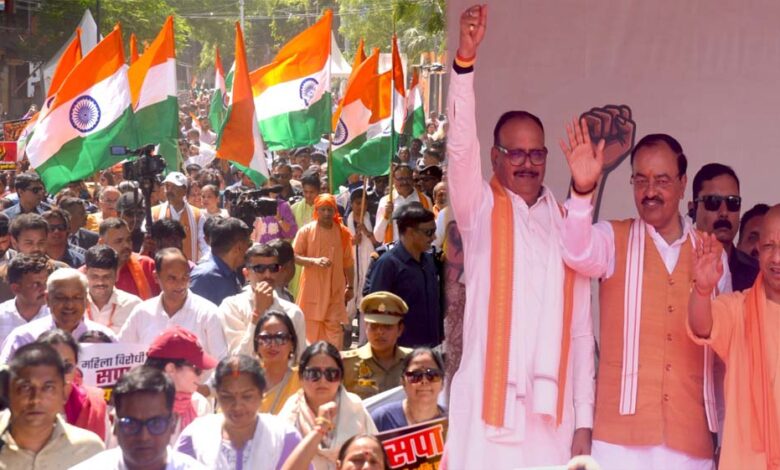 नारी शक्ति वंदन अधिनियम पर विपक्ष के षड्यंत्र के विरोध में मंगलवार को लखनऊ में ‘जन आक्रोश पदयात्रा’ में मुख्यमंत्री योगी आदित्यनाथ के साथ ही उपमुख्यमंत्री बृजेश पाठक व केशव प्रसाद मौर्य, पंचायती राज्यमंत्री ओमप्रकाश राजभर, राज्यसभा सांसद अरुण सिंह और केंद्रीय मंत्री पंकज चौधरी समेत हजारों महिलाओं ने सड़कों पर उतरकर कांग्रेस और समाजवादी पार्टी के खिलाफ जमकर नारेबाजी की। सभी ने एक सुर में कहा कि 17 अप्रैल को संसद में यह बिल पास होने वाला था, लेकिन कांग्रेस और सपा ने न सिर्फ इसका विरोध किया, बल्कि मतदान में इसे गिराने के बाद तालियां बजाकर खुशी मनाई। उन्होंने इसे महिलाओं के अधिकारों का हनन बताया और कहा कि 2027 के चुनाव में इन दलों को महिला आक्रोश का खामियाजा भुगतना पड़ेगा। केंद्रीय मंत्री पंकज चौधरी ने तो यहां तक कहा कि इंडी एलाइंस अब एंटी-वुमेन एलाइंस साबित हो चुका है।