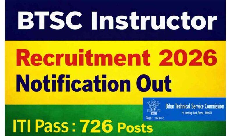 बिहार तकनीकी सेवा आयोग (बीटीएससी) ने इंस्ट्रक्टर (प्रशिक्षक) के विभिन्न 726 पदों पर भर्ती के लिए एक आधिकारिक अधिसूचना जारी की है। इन पदों के लिए ऑनलाइन माध्यम से आवेदन प्रक्रिया 15 अप्रैल से शुरू हो गई है और अप्लाई करने की अंतिम तिथि 15 मई निर्धारित की गई है। ऐसे में जो योग्य और इच्छुक उम्मीदवार एप्लीकेशन फॉर्म भरना चाहते हैं, उन्हें आधिकारिक वेबसाइट पर जाकर तय लास्ट डेट तक या उससे पहले अपना रजिस्ट्रेशन फॉर्म जमा करना होगा।
