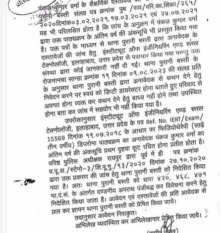 लेकिन कार्रवाई नहीं होने पर मामला कोर्ट चला गया। पंकज कुमार वर्मा पर करोड़ों के घोटाले के आरोपों की भी जांच जारी है। पंकज कुमार वर्मा की शैक्षणिक दस्तावेजों की जांच की गई। थाना पुरानी बस्ती द्वारा इंस्टीट्यूट आॅफ इंजीनियरिंग एंड रूरल टेक्नोलॉजी, इलाहाबाद, उत्तर प्रदेश से पत्राचार किया गया परन्तु उक्त संस्था द्वारा कोई जानकारी नहीं दी गई। अब कोर्ट के आदेश पर पुरानी बस्ती पुलिस ने धारा 420, 468, 471 के तहत कार्रवाई शुरू कर दी है।
