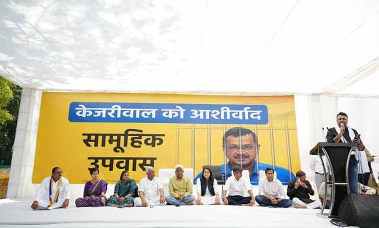 आम आदमी पार्टी के शीर्ष नेता केजरीवाल की गिरफ्तारी के विरोध में एक दिवसीय उपवास के लिए जंतर-मंतर पर एकत्र हुए