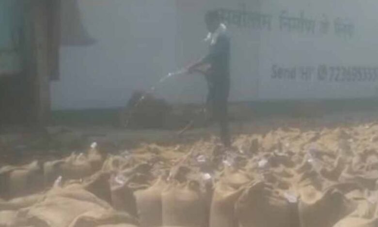 सागर में खरीदी केंद्र पर सरकारी गेहूं को पानी से भिगोया