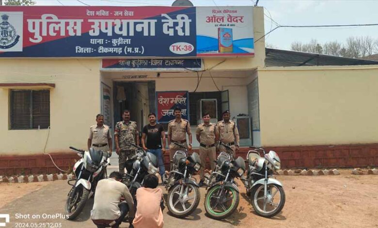 एसपी के निर्देश पर चौकी प्रभारी देरी चन्दन शाक्य एवं उनकी टीम ने आरोपियों का सुराग लगाने के साथ ही उन्हें गिरफ्तार करने में कामयाबी हासिल की। मोटरसाइकिल चोरी के आरोपियों के गिरफ्तार पर आम लोगों ने भी राहत की सांस ली है। पुलिस अधीक्षक टीकमगढ रोहित काशवानी द्वारा चोरी हुए वाहनों को बरामद कर आरोपियों को गिरफ्तार करने हेतु निर्देशित किया है। इसी तारतम्य मे अतिरिक्त पुलिस अधीक्षक टीकमगढ सीताराम व एसडीओपी टीकमगढ राहुल कटरे के मार्गदर्शन में थाना प्रभारी निरीक्षक पंकज शर्मा के नेतृत्व में चौकी प्रभारी देरी उप निरीक्षक चंदन शाक्य द्वारा सूरज पिता भोला चढार उम्र 19 साल निवासी अचढट थाना नौगांव, सेवाराम पिता लल्लू चढार उम्र 21 साल निवासी देरी से चौकी देरी थाना खरगापुर अंतर्गत चोरी की गई पांच मोटर साईकिलो को दिनांक 24.05.24 को जप्त किया गया।