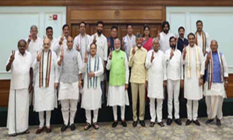 एनडीए की बैठक में भाजपा राष्ट्रीय अध्यक्ष जेपी नड्डा ने गुलदस्ता भेंटकर और सभी नेताओं ने तालियां बजाकर प्रधानमंत्री मोदी का अभिनंदन किया। बैठक में मौजूद सभी दलों के नेताओं ने जीत के लिए प्रधानमंत्री मोदी को बधाई देते हुए उनके नेतृत्व में आस्था भी व्यक्त की। पीएम मोदी के बगल में एक तरफ चंद्रबाबू नायडू, नीतीश कुमार और एकनाथ शिंदे और दूसरी तरफ जेपी नड्डा, राजनाथ सिंह और अमित शाह बैठे नजर आए।