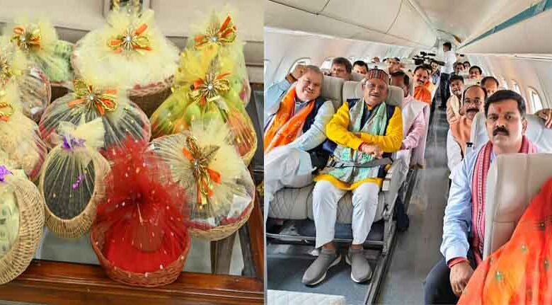 जयश्री राम की जयकारे के साथ मंत्रिमण्डल के सभी सदस्य अपने ईष्ट प्रभु श्री राम के दर्शन के लिए अयोध्या के लिए विशेष विमान से रवाना हुए।मुख्यमंत्री ने इस मौके पर कहा कि पूरा मंत्रिमण्डल अपने आराध्य प्रभु श्री राम के दर्शन के लिए अयोध्या जा रहा है। हम सभी प्रभु से देश और प्रदेश की खुशहाली और समृद्धि के लिए कामना करेंगे। मुख्यमंत्री श्री विष्णु देव साय प्रभु श्री राम को छत्तीसगढ़ के विष्णु भोग चावल, सीताफल, विशेष रूप से तैयार करवाई गई मिठाईयां, अईरसा और करी लड्डू का भोग चढ़ाएंगे। साथ ही प्रभु की वस्त्र सज्जा के लिए स्थानीय कोसे से बने वस्त्र भी अर्पित करेंगे। गौरतलब है कि मुख्यमंत्री ने जो उपहार की थाली तैयार की है, उस पर गौर करें तो पाएंगे कि इसके सभी पदार्थ राम कथा से संबंधित ही हैं। चाहे शबरी के बेर हो, विष्णु भोग चावल या फिर सीताफल, इन सबसे प्रभु के छत्तीसगढ़ प्रवास का दिव्य स्मरण होता है।