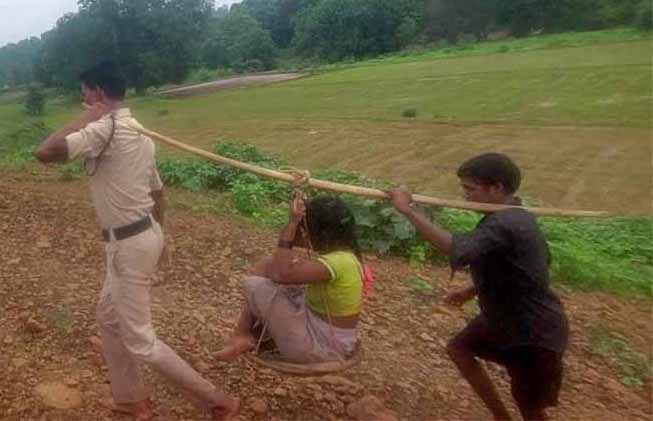 छत्तीसगढ़ के रायगढ़ जिले की पुलिस ने मानवता की मिशाल पेश की है. कापू थाना क्षेत्र के अंतर्गत पहाड़ों और जंगलों के बीच ग्राम पारेमेर घुटरूपारा बसा है. बरसात के दिनों में गांव की ओर चार पहिया वाहन का पहुंचना मुश्किल है. ऐसे में घुटरूपारा में एक महिला को प्रसव पीड़ा उठना परिवार के लिए मुसीबत बन गया. परिवार ने डायल 112 को मदद के लिए संपर्क किया. सूचना पर वाहन से टीम मदद के लिए रवाना हुई लेकिन गाड़ी के लिए रास्ता नहीं होने से आरक्षक पैदल ही पीड़िता के घर पहुंचे और बिना देरी किये कावड़ में बैठकर गर्भवती महिला को पहाड़ी और नाला पार करते हुए 3 किलोमीटर का सफर तय कर वाहन तक लाए. जिसके बाद महिला को वाहन से अस्पताल ले जाया जा रहा तभी बीच रास्ते में प्रसव पीड़ा बढ़ गई और रास्ते में ही सूझबूझ के साथ मितानिनों की मदद से महिला का प्रसव कराया गया.