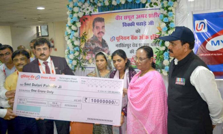 दिनांक 04 मई 2024 को जम्मू-कश्मीर के पूंछ इलाके में आंतकवादियों द्वारा वायुसेना के काफिलें पर हमला किया गया था , जिसमें स्व.श्री विक्की पहाड़े वीर गति को प्राप्त हुए । छिंदवाड़ा के इस शहीद बेटे के सम्मान में दिनांक 23.07.2024 को छिंदवाड़ा स्थित यूनियन बैंक ऑफ इंडिया की स्थानीय शाखा में एक सम्मान समारोह आयोजित किया गया ,जिसमें यूनियन बैंक के नर्मदापुरम के क्षेत्र प्रमुख श्री राजकुमार सेन द्वारा शहीद के परिवार को 1 करोड़ रुपये की बीमा राशि प्रदान की गई । स्व.श्री विक्की पहाड़े का वेतन खाता यूनियन बैंक ऑफ इंडिया के साथ था । जिसमें समझौता ज्ञापन के तहत उनके परिवार को यह बीमा राशि प्राप्त हुई । यूनियन बैंक ऑफ इंडिया उनके परिवार के साथ एस कठिन समय में सहयोग के लिए प्रतिबद्ध हैं।