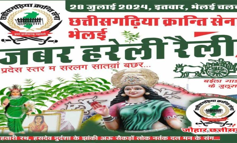 रविवार 28 जुलाई को छत्तीसगढ़िया क्रान्ति सेना के तत्वावधान में अंबेडकर मूर्ति, पावरहाउस भिलाई से लगातार सातवीं बार जबर हरेली रैली निकलेगी । इस रैली में हजारों लोक कलाकार एवं लाखों छत्तीसगढ़ियाजन अपने प्रथम त्यौहार हरेली को उल्लासमय वातावरण में मनाते चलेंगे । सुसज्जित बैलगाड़ियों का जूलूस, बस्तरिहा रेला-पाटा, गेड़ी, पंथी, करमा, सुवा, राऊत नाचा, डंडा नृत्य करते हुए लोग प्रकृति के साथ-साथ अपनी मूल संस्कृति को बचा कर रखने का संदेश देते चलेंगे । छत्तीसगढ़ महतारी और छत्तीसगढ़िया महापुरुषों की झांकी, हसदेव जंगल रक्षा का संदेश देती चलित झांकी रैली के विशेष आकर्षण होंगे ।