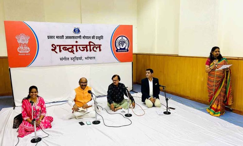 भोपाल। आकाशवाणी भोपाल द्वारा आज़ादी की अमृत महोत्सव और "हर घर तिरंगा अभियान " के अंतर्गत "शब्दांजलि" कार्यक्रम की प्रथम कड़ी का आयोजन किया गया. देशभक्ति रचनाओं की प्रस्तुति के इस कार्यक्रम में आकाशवाणी भोपाल के उप महानिदेशक अभियांत्रिकी यशवंत चिवण्डे , उप निदेशक अभियांत्रिकी ए एच हाशमी , कार्यक्रम प्रमुख राजेश भट्ट , कार्यक्रम अधिकारी अनामिका चक्रवर्ती सहित आकाशवाणी भोपाल के अधिकारीगण और सुधि साहित्यकार मौजूद थे । आमंत्रित कवि में शामिल थे सुप्रसिद्ध राष्ट्रीय कवि चौधरी मदन मोहन समर , उर्दू के वरिष्ठ शायर अंजुम बाराबंकी , वीर रस व ओजपूर्ण कवि धर्मेन्द्र सोलंकी और युवा कवयित्री शिवांगी शर्मा । कार्यक्रम प्रमुख राजेश भट्ट ने अपने स्वागत वक्तव्य में शब्द सुमनों द्वारा सभी उपस्थितों का स्वागत किया और शब्दांजलि कार्यक्रम की विस्तृत रूपरेखा सदन के समक्ष रखी। तत्पश्चात सूत्रधार धर्मेंद्र सिंह सोलंकी सहित सभी कवियों ने अपनी ओजपूर्ण कविताओं से माहौल को देशभक्ति की भावना से भर दिया. चौधरी मदनमोहन समर ने अपनी ओजपूर्ण आवाज़ में पढ़ा "चांद तिरंगा जय भारत – सम्मान तिरंगा जय भारत , घर घर का मान तिरंगा है अभिमान तिरंगा जय भारत" वीररस से परिपूर्ण इस कविता को खूब सराहना मिली. संवेदना के कवि धर्मेंद्र सिंह सोलंकी ने कहा "स्वतंत्रता एक पर्व नहीं , धर्म हमारा है , इसकी खातिर मर मिट जाना कर्म हमारा है" इस कविता पर आपने खूब तालियाँ बटोरी. युवा कवियित्री ने शिवांगी शर्मा ने कविता पढ़ी "मन के पाप पुण्य की गठरी धोने को, अविरल बहती भारत में मां गंगा है" देशप्रेम से ओतप्रोत इस कविता को सभी ने सरहा. उर्दू के सशक्त हस्ताक्षर और जाने माने शायर अंजुम बाराबंकी ने स्वतंत्रता दिवस के अवसर पर ग़ज़ल पढ़ी "खुशबुओं का पयाम लाए हैं , फूल जैसा क़लाम लाए हैं, हम स्वाधीनता दिवस पर आज , ज़िंदगी का सलाम लाए हैं" अंजुम ने जैसे जैसे शेर पढ़ते गए पूरा हॉल तालियो और वाह वाह की अव्वज़ से गूंज उठा. वीर रस से ओत- प्रोत गीत , ग़ज़ल और शायरियों से उपस्थित दर्शकों को भी देश भक्ति के रंग से सराबोर कर दिया । इसके बाद उप निदेशक अभियांत्रिकी ए एच हाशमी ने सभी कवियों शायरों और अधिकारियों सहित सुधी श्रोताओं का आकाशवाणी की ओर से आभार प्रदर्शन किया. कार्यक्रम का संचालन प्रसिद्ध कवियित्री और आकाशवाणी में महिलाओं के कार्यक्रम की प्रस्तोता शशि बंसल ने किया.