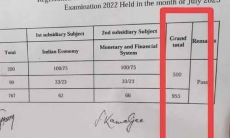 बिहार में शिक्षा व्यवस्था को लेकर कई तरह की बातें सामने आती रहती हैं। अब राज्य के एक चर्चित विश्वविद्यालय में ऐसा कारनामा हुआ है जिसे सुनकर आप दंग रह जाएंगे। दरअसल यहां एक छात्र को कुल 500 अंकों की परीक्षा में 955 अंक आए हैं। छात्र के रिजल्ट की कॉपी को सोशल मीडिया पर शेयर किया गया है जिसके बाद से लोग इस रिपोर्ट कार्ड को देख कर हैरान हैं।